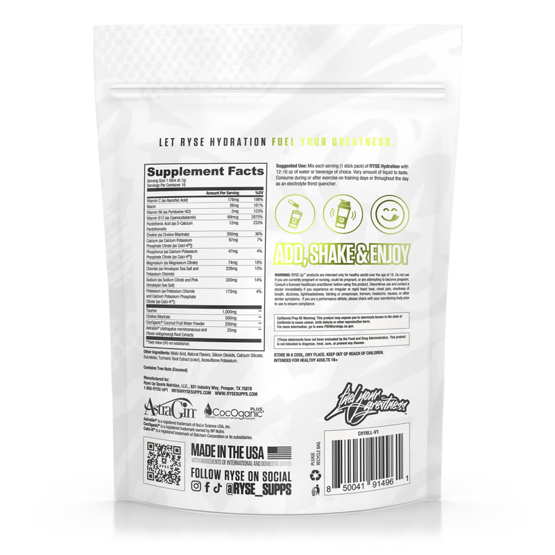 RYSE Hydration is your daily health and hydration optimizer. Through the inclusion of full spectrum electrolytes, vitamins, and more, RYSE Hydration keeps you performing at your best both physically and mentally.