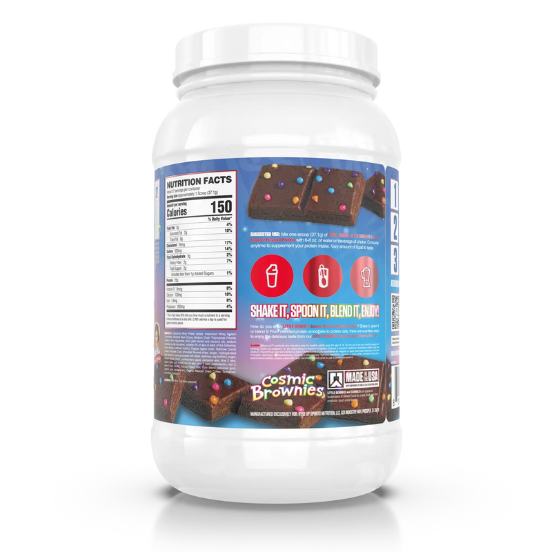 Instantized Whey Protein Isolate, Instantized Whey Protein Concentrate, Alkalized Black Cocoa, Medium Chain Triglyceride Powder [medium chain triglycerides (from palm kernel and coconut oil), sodium caseinate (a milk derivative), contains 2% or less of each of the following: silicon dioxide, sunflower lecithin], Organic Agave Inulin, Rainbow Candy Coated Chocolate Chips [chocolate flavored chips, (sugar, hydrogenated palm kernel oil, cocoa (processed with alkali), dextrose, soy lecithin), sugar, titanium dioxide (color), confectioner's glaze, carnauba wax, blue 2 lake, yellow 5 lake, gum arabic, red 40 lake, blue 1 lake, maltodextrin, red 3, yellow 6 lake, red 40], Natural Flavor, Salt, Gum Blend (cellulose gum, xanthan gum, carrageenan), Organic Mexican Dried Coffee, Sucralose, Acesulfame Potassium.