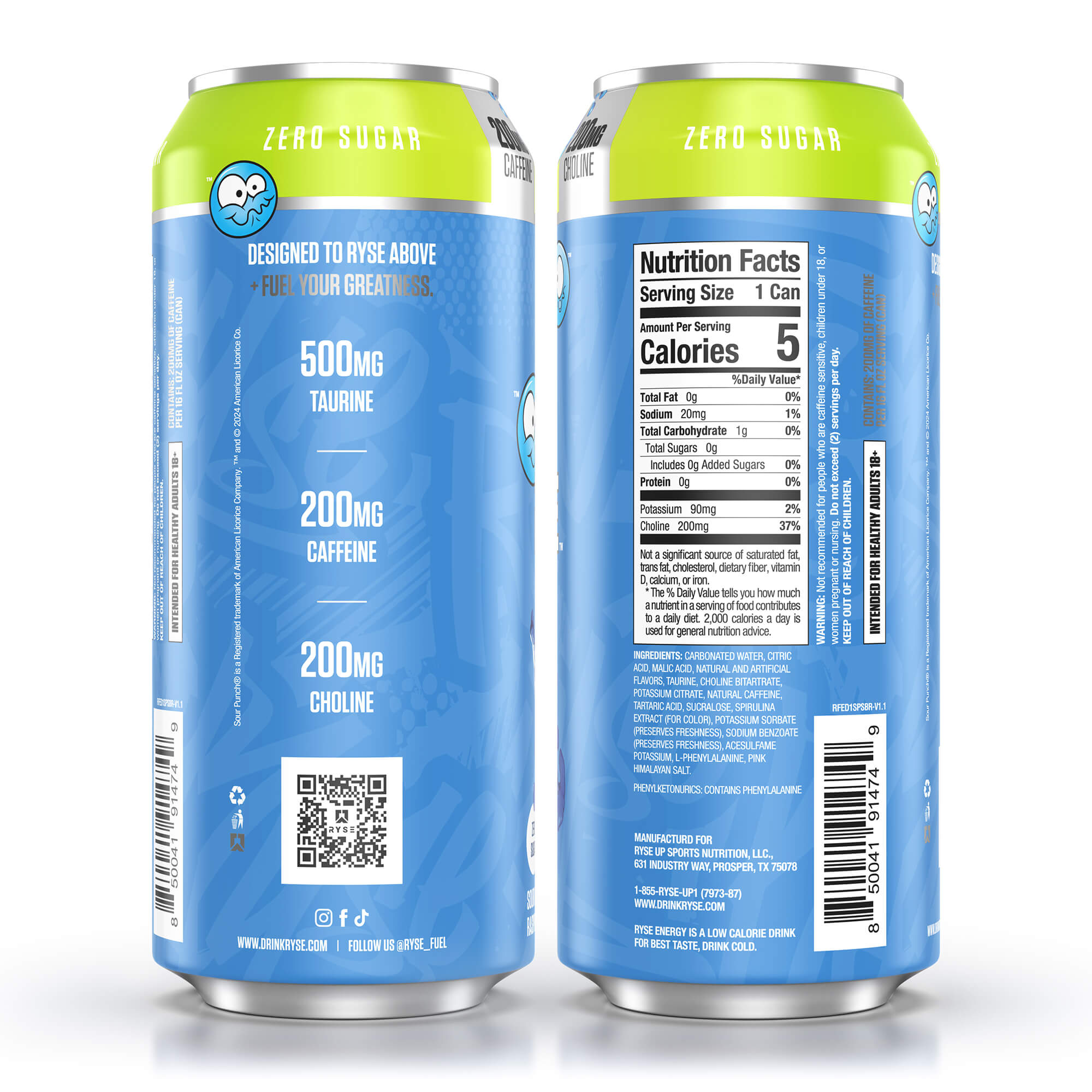 INGREDIENTS: Carbonated Water, Citric Acid, Natural & Artificial Flavors, Taurine, Choline Bitartrate, Potassium Citrate, Natural Caffeine, Sucralose, Potassium Sorbate (preserves freshness), Sodium Benzoate (preserves freshness), Acesulfame Potassium, Phenylalanine, Pink Himalayan Salt Phenylketonurics: Contains Phenylalanine