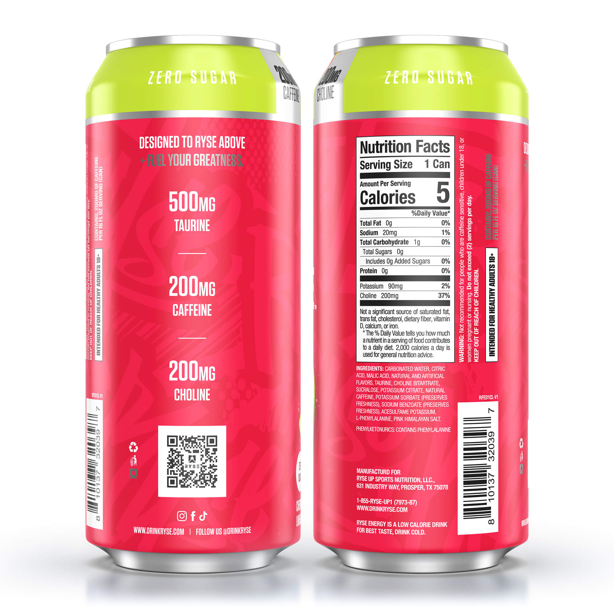 INGREDIENTS: Carbonated Water, Citric Acid, Natural & Artificial Flavors, Taurine, Choline Bitartrate, Potassium Citrate, Natural Caffeine, Sucralose, Potassium Sorbate (preserves freshness), Sodium Benzoate (preserves freshness), Acesulfame Potassium, Phenylalanine, Pink Himalayan Salt Phenylketonurics: Contains Phenylalanine